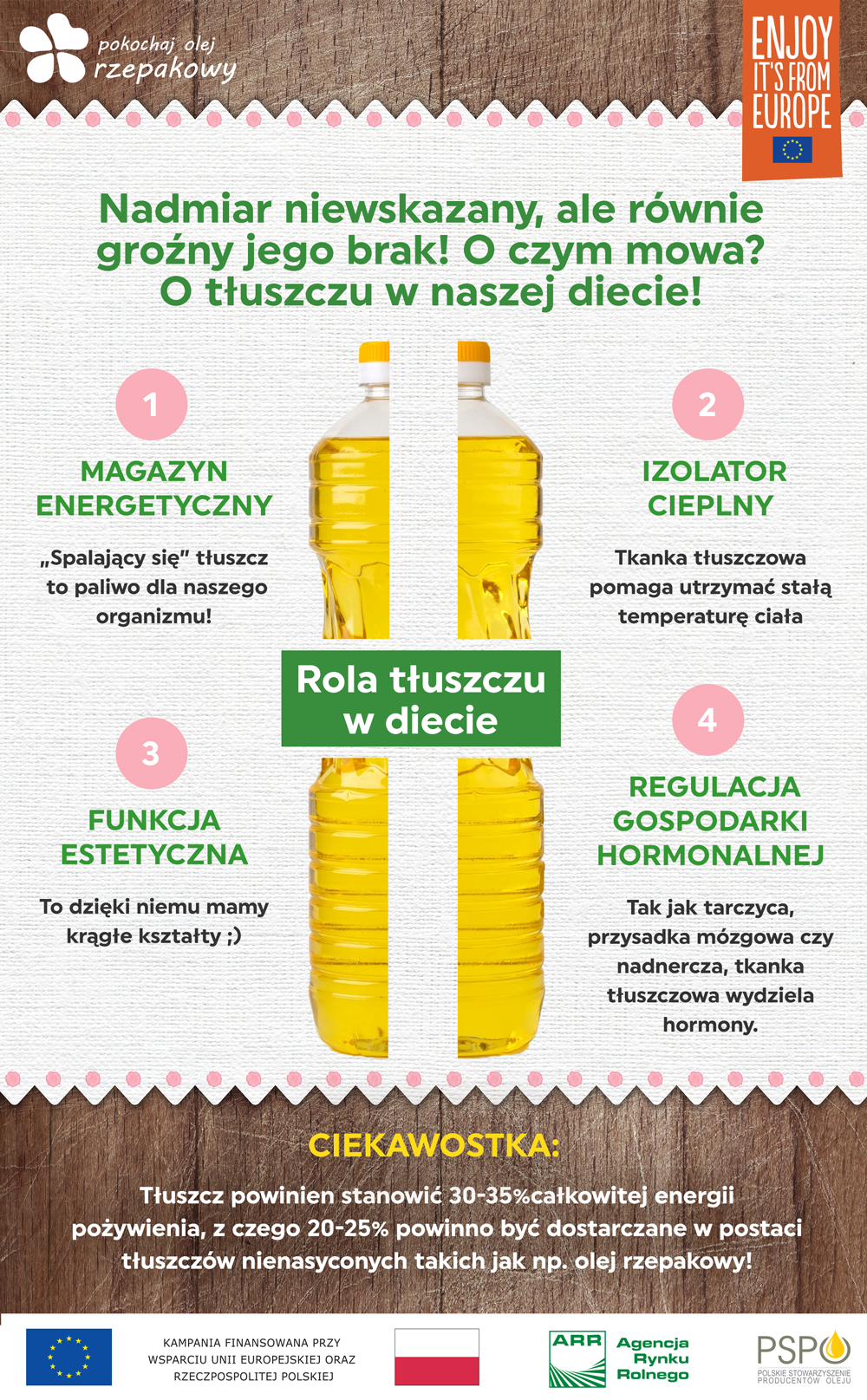 Jeśli dbasz o swoje zdrowie wiesz, że kompleksowe działanie jest najważniejsze. Dobrze się odżywiasz, odżywiaj również swoje ciało i wykorzystuj do tego naturalne produkty.Jeśli znudził ci się tradycyjny sos do sałatek na bazie oliwy, stwórz swoją własną bazę. Dzięki temu, że rafinowany olej rzepakowy ma neutralny smak i zapach z łatwością przejmie on aromaty przypraw, ziół i warzyw. Do mniejszej butelki przelej porcję oleju, dodaj ulubione składniki: czosnek, paprykę chilli, tymianek lub inne zioła, odstaw na kilka godzin a najlepiej na cały dzień i ciesz się własnym smakowym olejem. Odkryj nowe smaki. Czyż to nie proste?